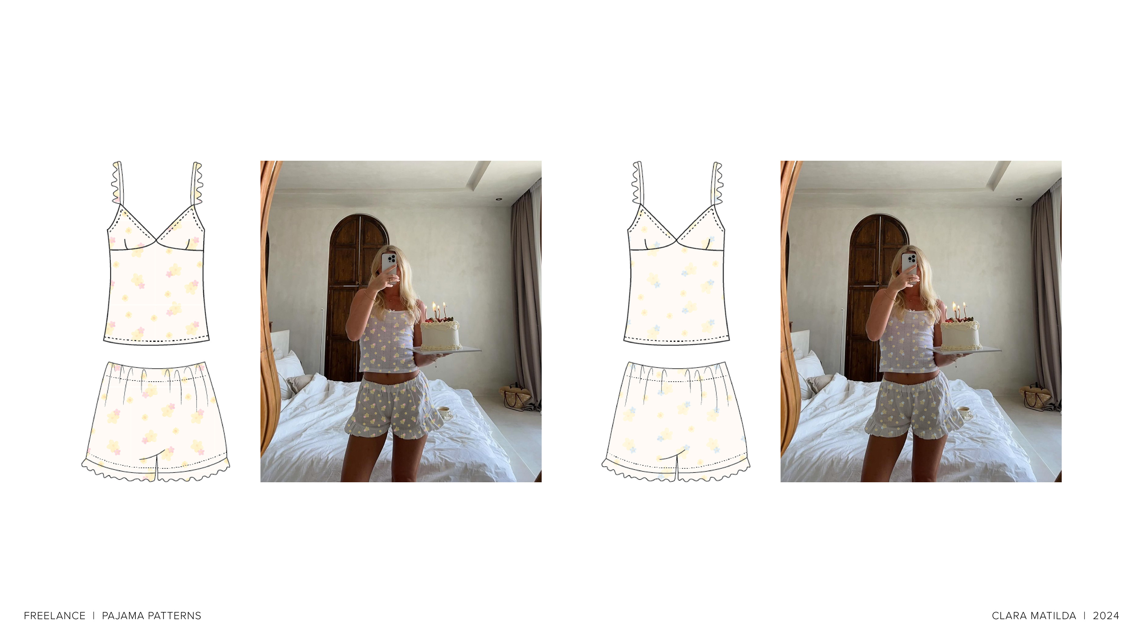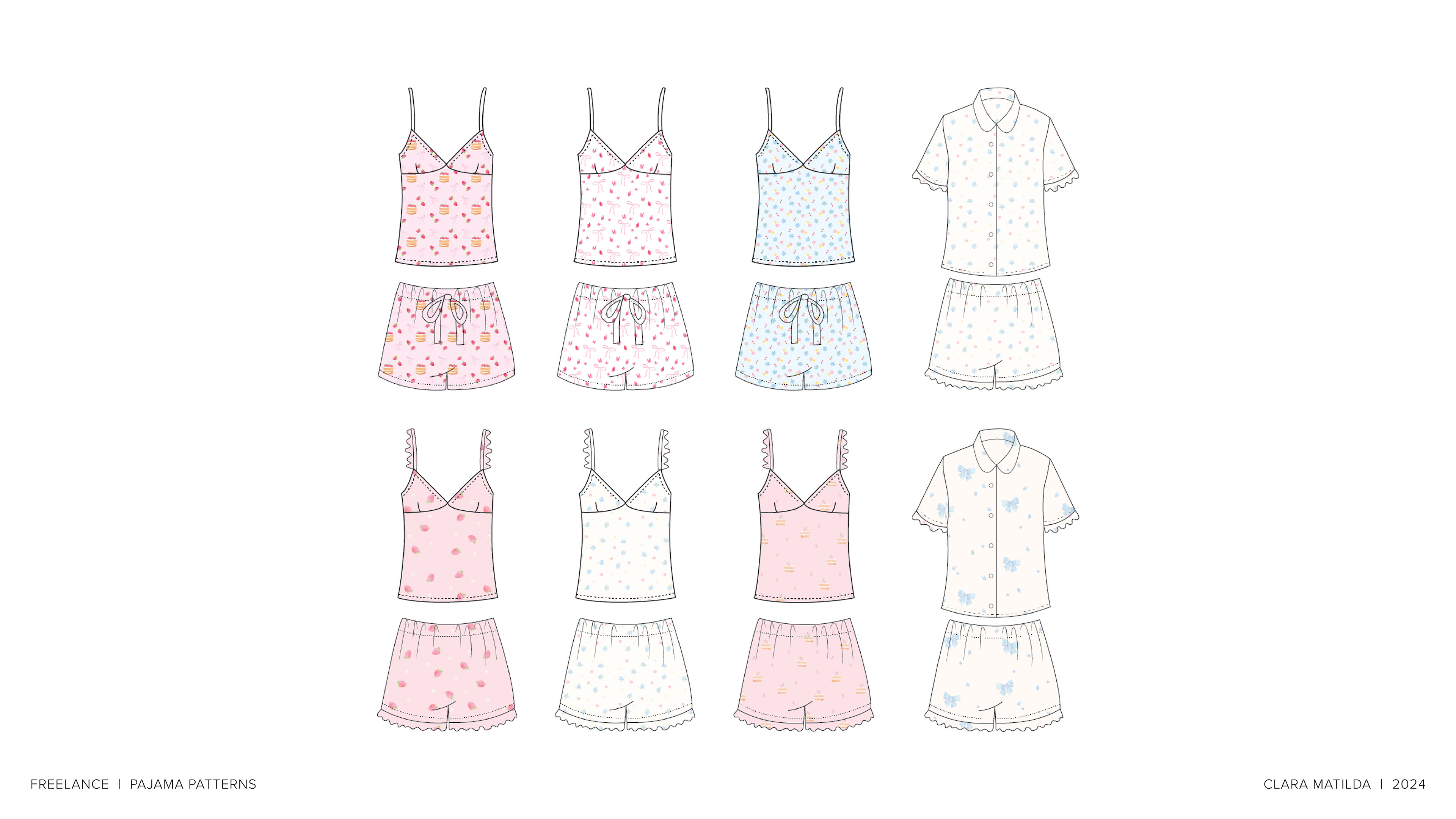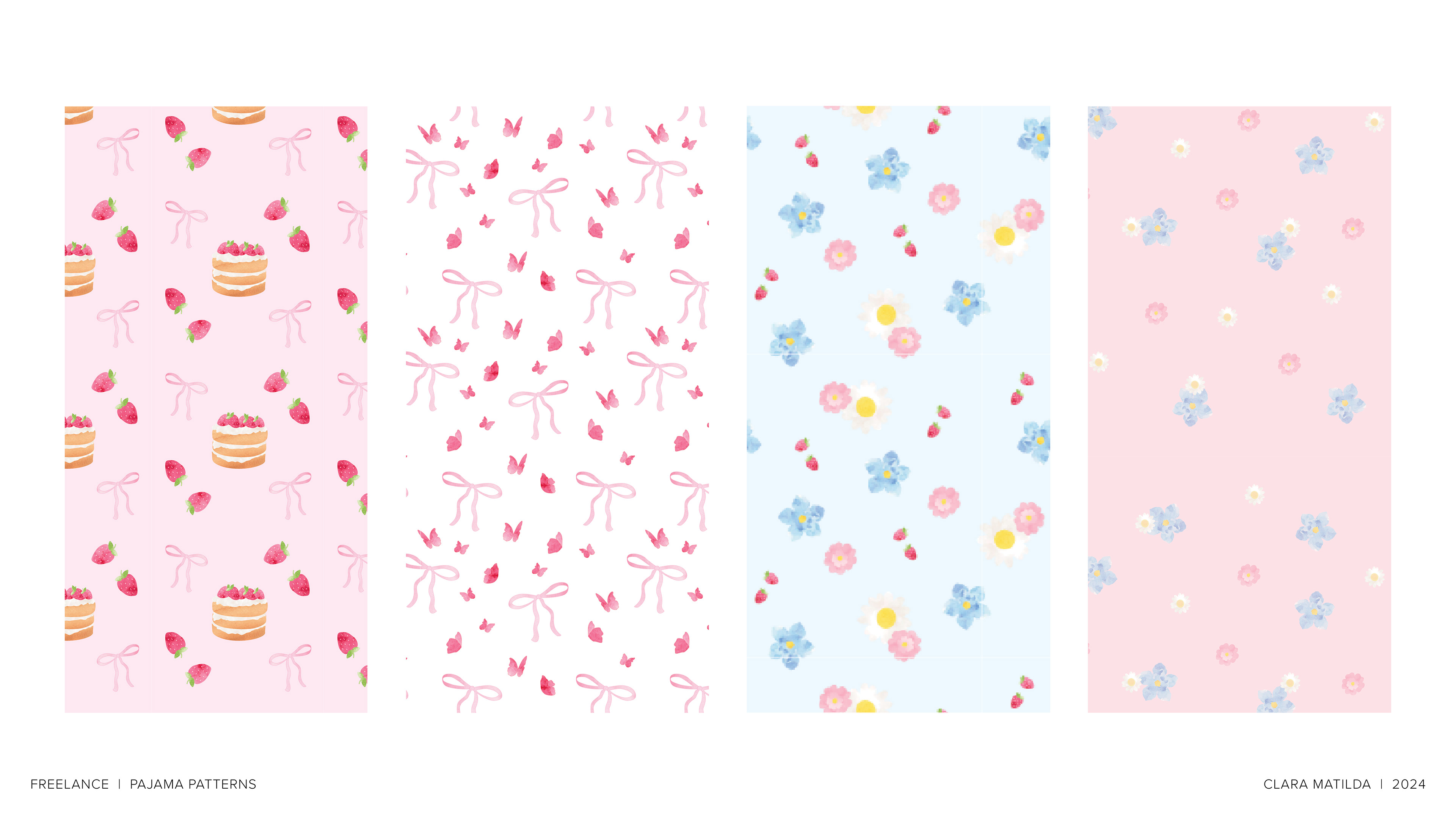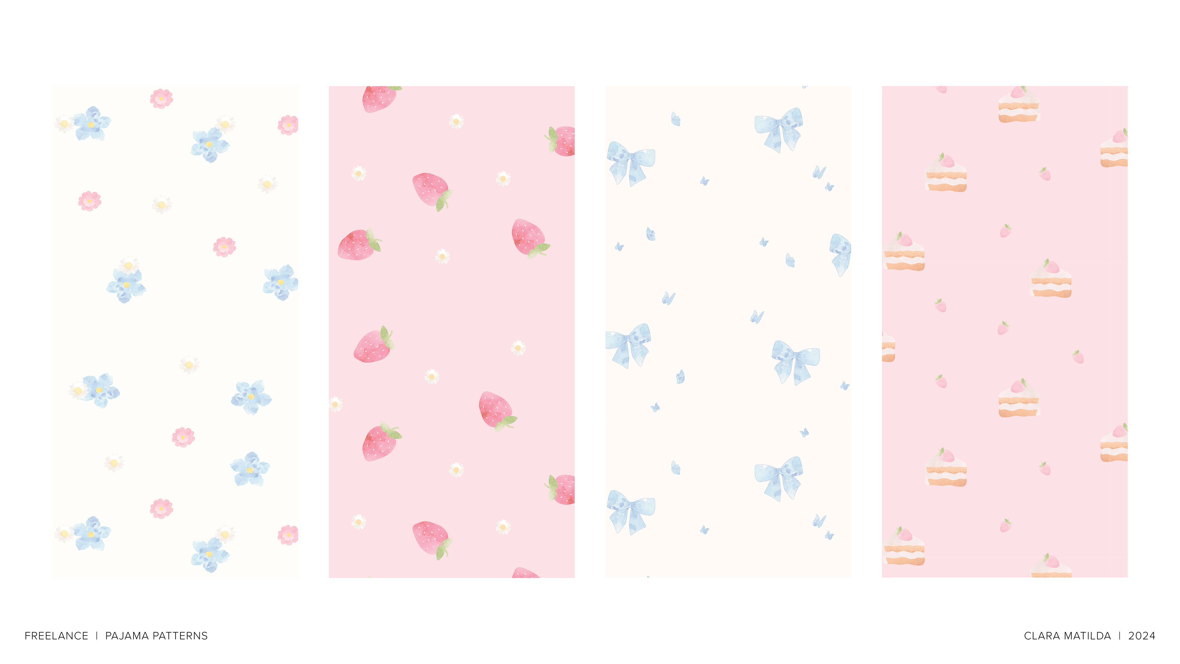 My client wanted a pattern that felt soft, cozy and girlie, while containing elements associated with Swedish summers such as strawberry cake, forget me not and daisies.